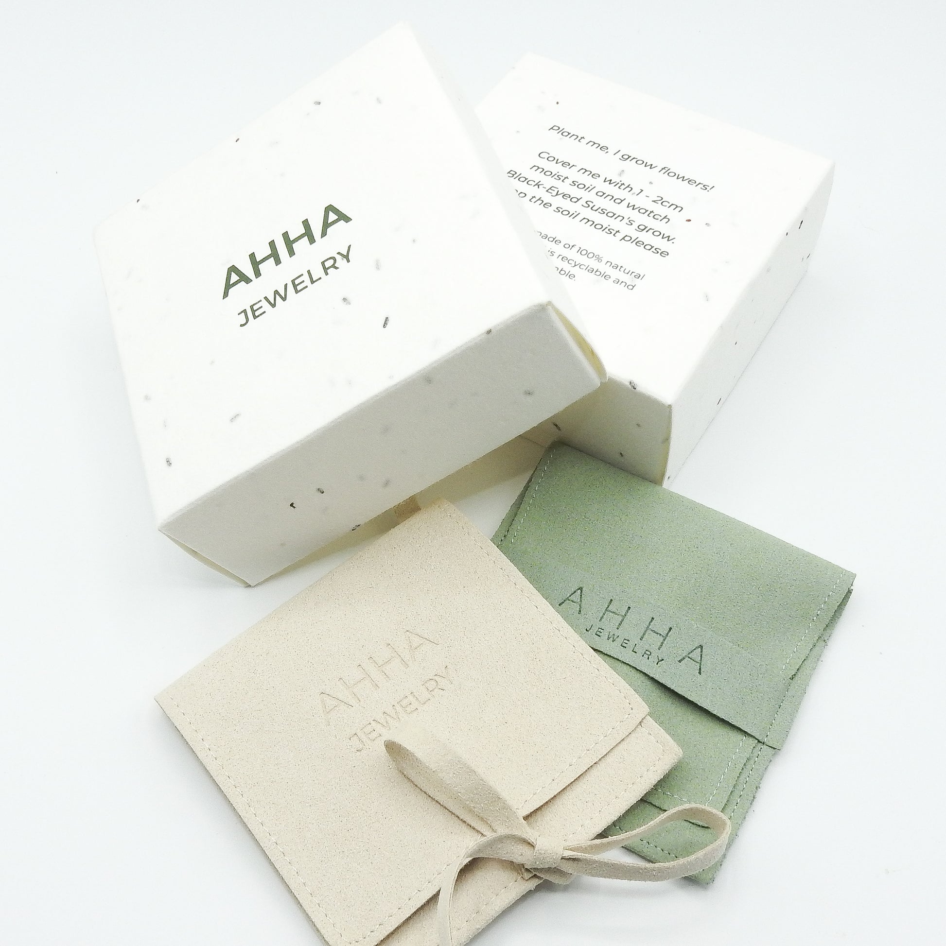 All items arrive beautifully packaged and ready for gift giving. Our gift boxes can be planted and will grow flowers. The pouches are reusable and washable. Each box comes with a special heartfelt message from the jewelry to its human.